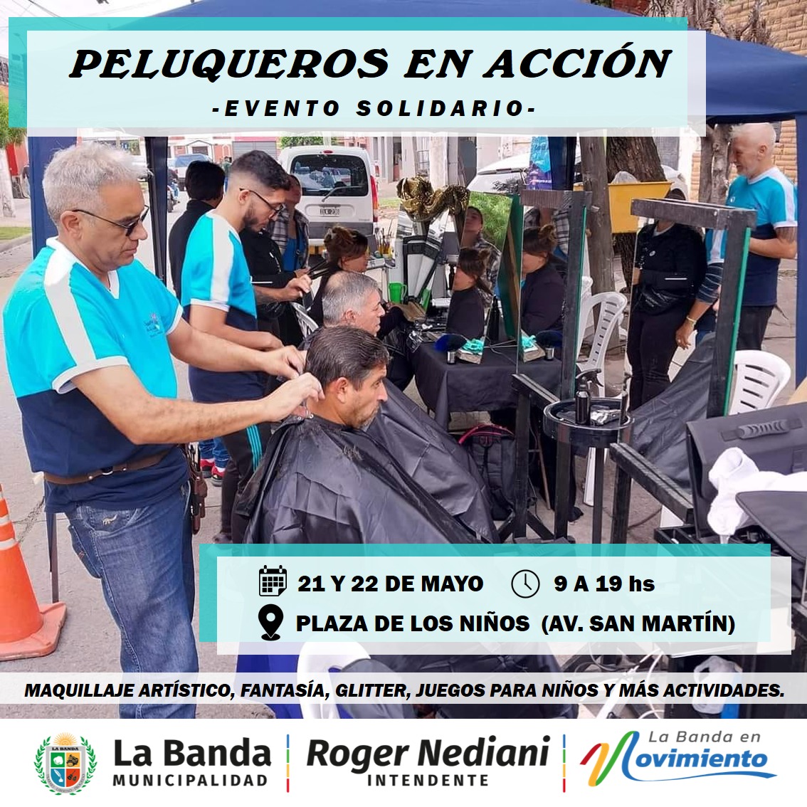 La municipalidad de La Banda, invita al público en general a participar de un evento solidario denominado “Peluqueros en acción”, que se va realizar el domingo 21 y el lunes 22 de mayo en la plaza de los niños sita en Av. San Martin 550, el mismo comenzará desde las 9 hasta las 18 horas.