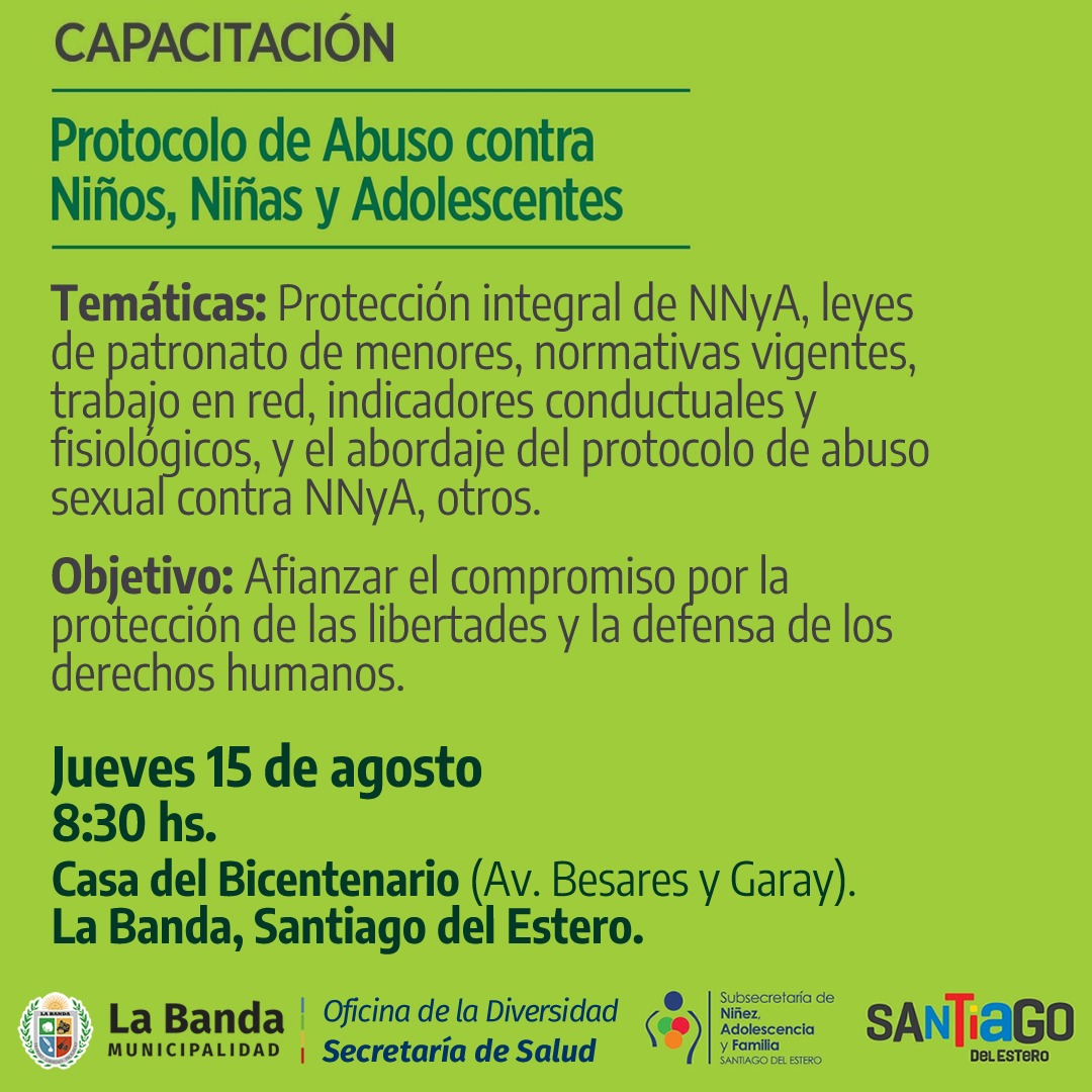 Por iniciativa del intendente Roger Nediani, a través de la Secretaría de Salud y la Oficina de la Diversidad, el próximo jueves 15 de agosto a las 8:30, se realizará una capacitación sobre el Protocolo de Abuso contra Niños, Niñas y Adolescentes en la Casa del Bicentenario, ubicada en Av. Cte. Besares esquina Garay.