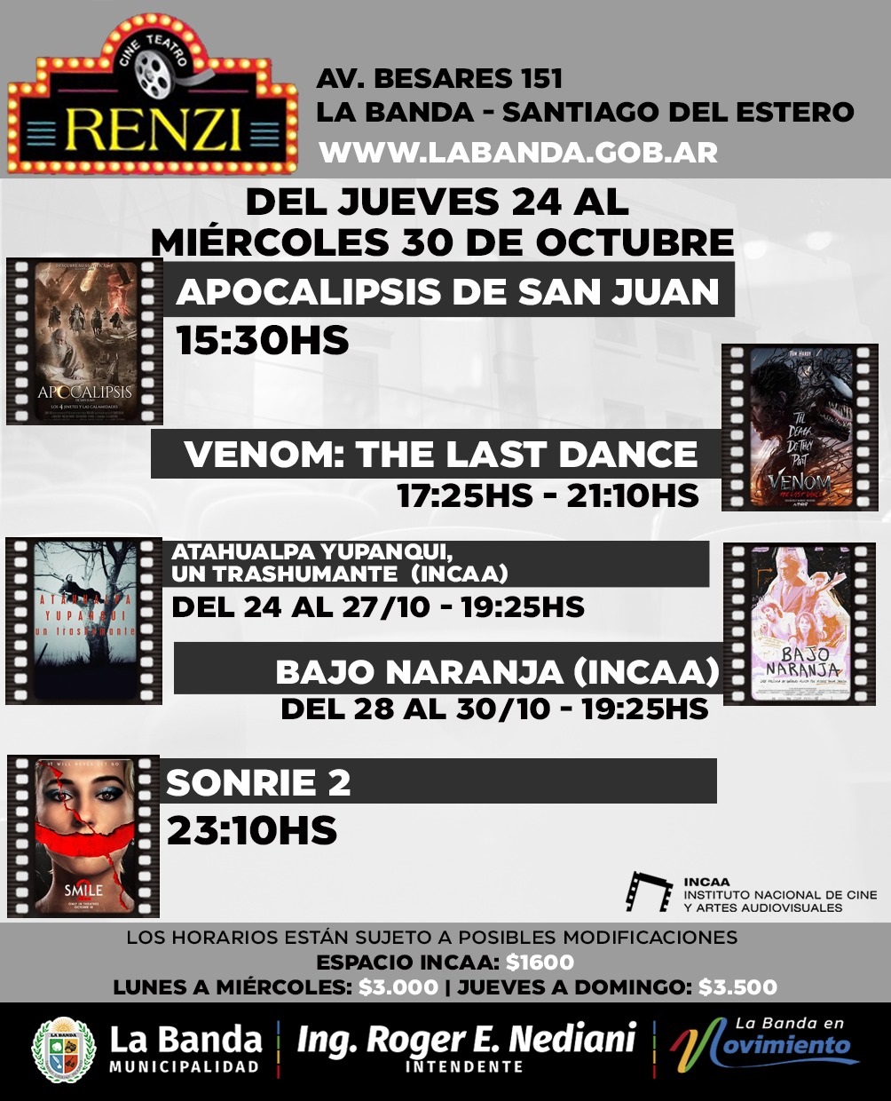El Cine Teatro Renzi, dependiente de la Secretaría de Comunicación de la Municipalidad de La Banda, proyectará en su histórica sala las películas “Apocalipsis San Juan”, “Venom: El último baile”, “Atahualpa Yupanqui, un transeúnte” y “Bajo naranja”.