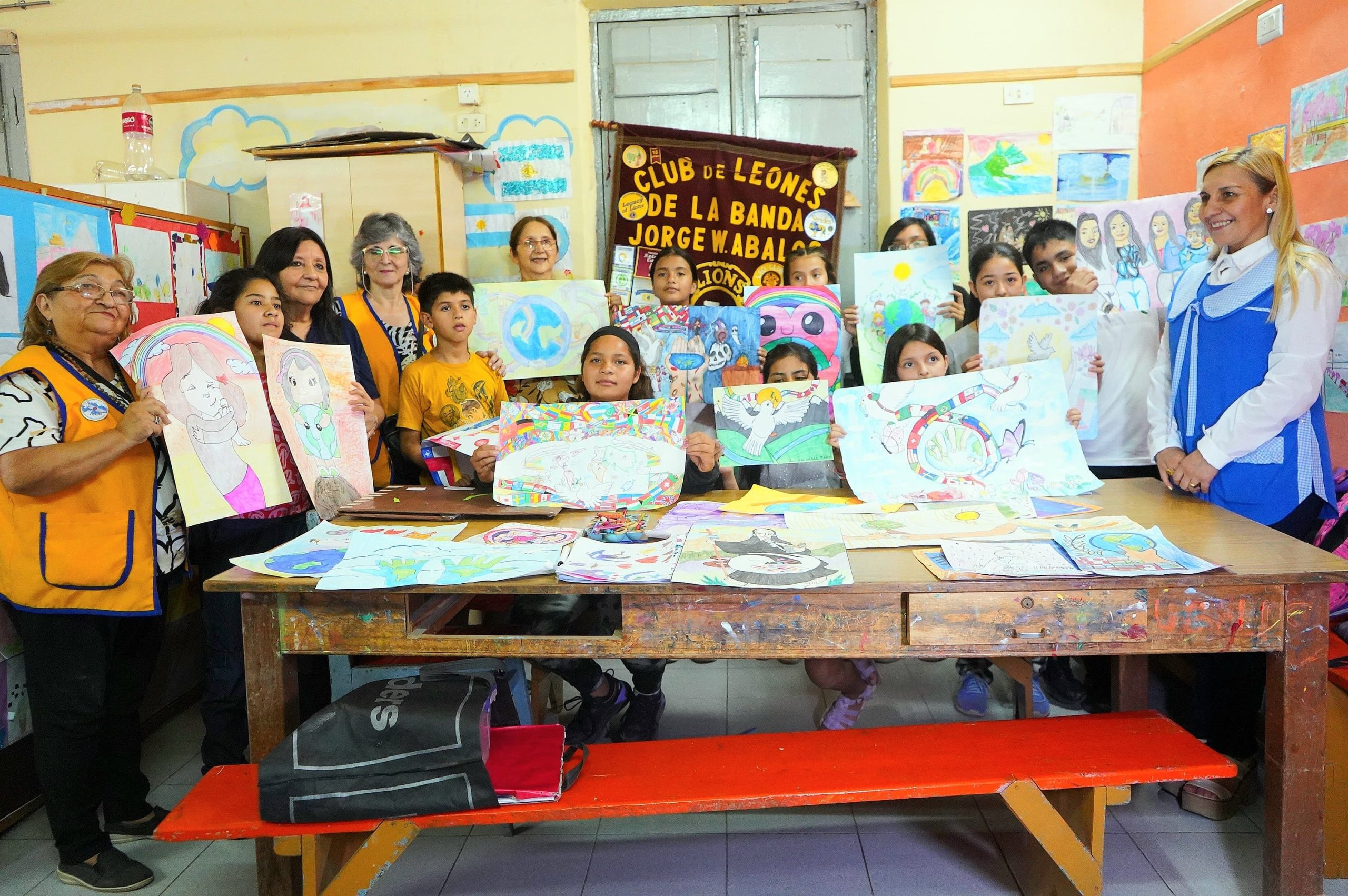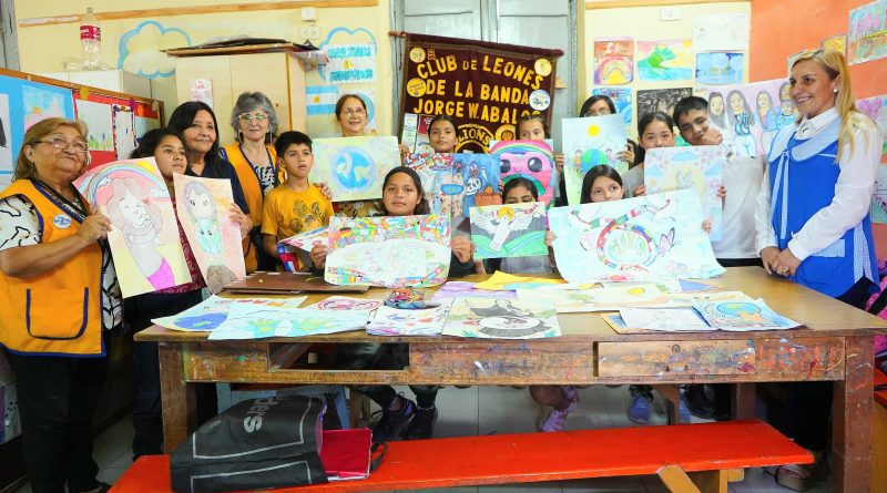 Integrantes del Club de Leones “Jorge Washington Ábalos” visitaron la Escuela Municipal de Artes Plásticas “Juanita Briones”, dónde recogieron los carteles elaborados por los niños que participarán en la instancia distrital del Certamen Internacional del “Cartel por la Paz”.
