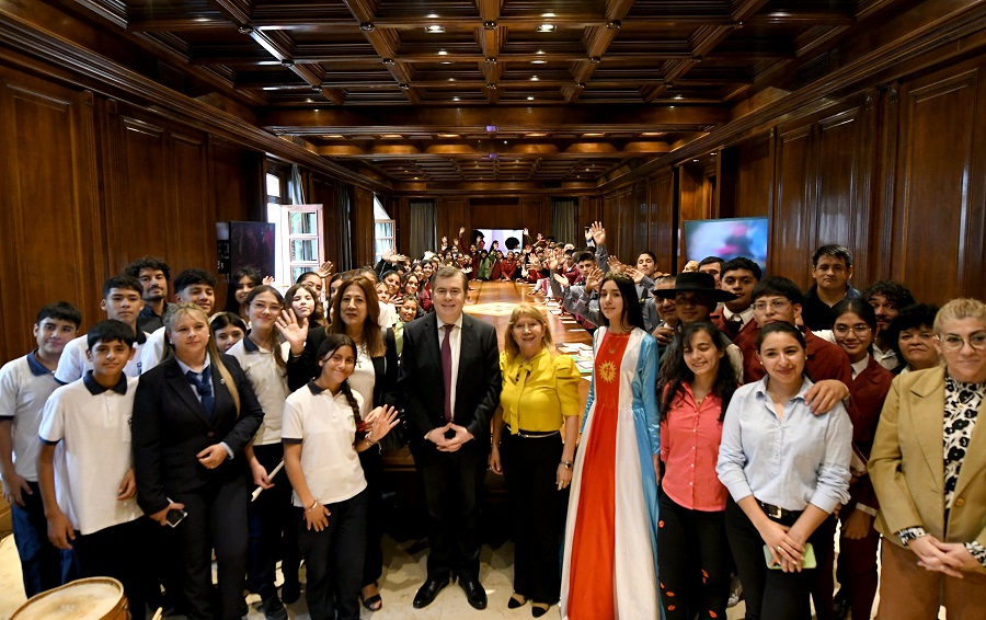 El gobernador Gerardo Zamora recibió este martes en Casa de Gobierno la visita de 50 alumnos de la Escuela Técnica N° 13 “Prof. Julio Olivera” de la localidad de Estación Simbolar y 14 chicos de la Escuela Secundaria N° 8 “General Antonio Taboada” de Clodomira, ambos establecimientos ubicados en el departamento Banda, en lo que fue el cierre anual del programa “Conociendo mi provincia”.