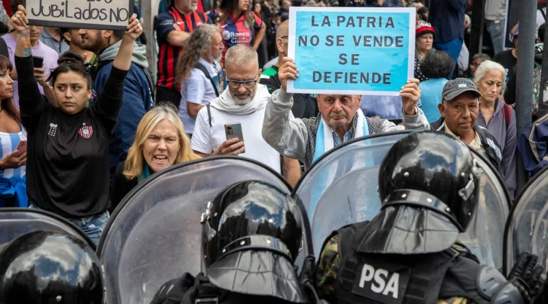 Afuera, la movilización de jubilados en reclamo por la prórroga de la moratoria previsional y la restitución del 100% de los medicamentos del PAMI terminó con una fuerte represión de la Policía Federal y la Policía de la Ciudad. Hubo heridos, detenidos y escenas de extrema violencia, como la agresión a una jubilada por parte de un efectivo y el impacto de un cartucho de gas lacrimógeno que provocó una fractura de cráneo al reportero gráfico Pablo Grillo.