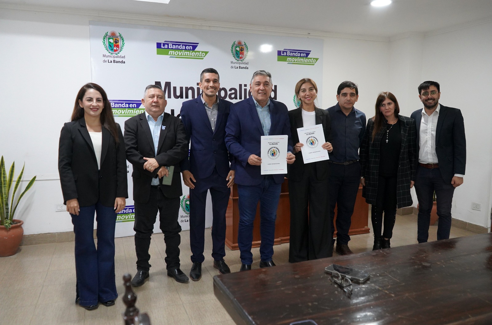 Durante la firma, el intendente estuvo acompañado por el viceintendente Gabriel Santillán; la secretaria de Gobierno, Victoria Torres; el concejal, Miguel Montenegro; escribana municipal, María Laura Tula Rizo y demás.