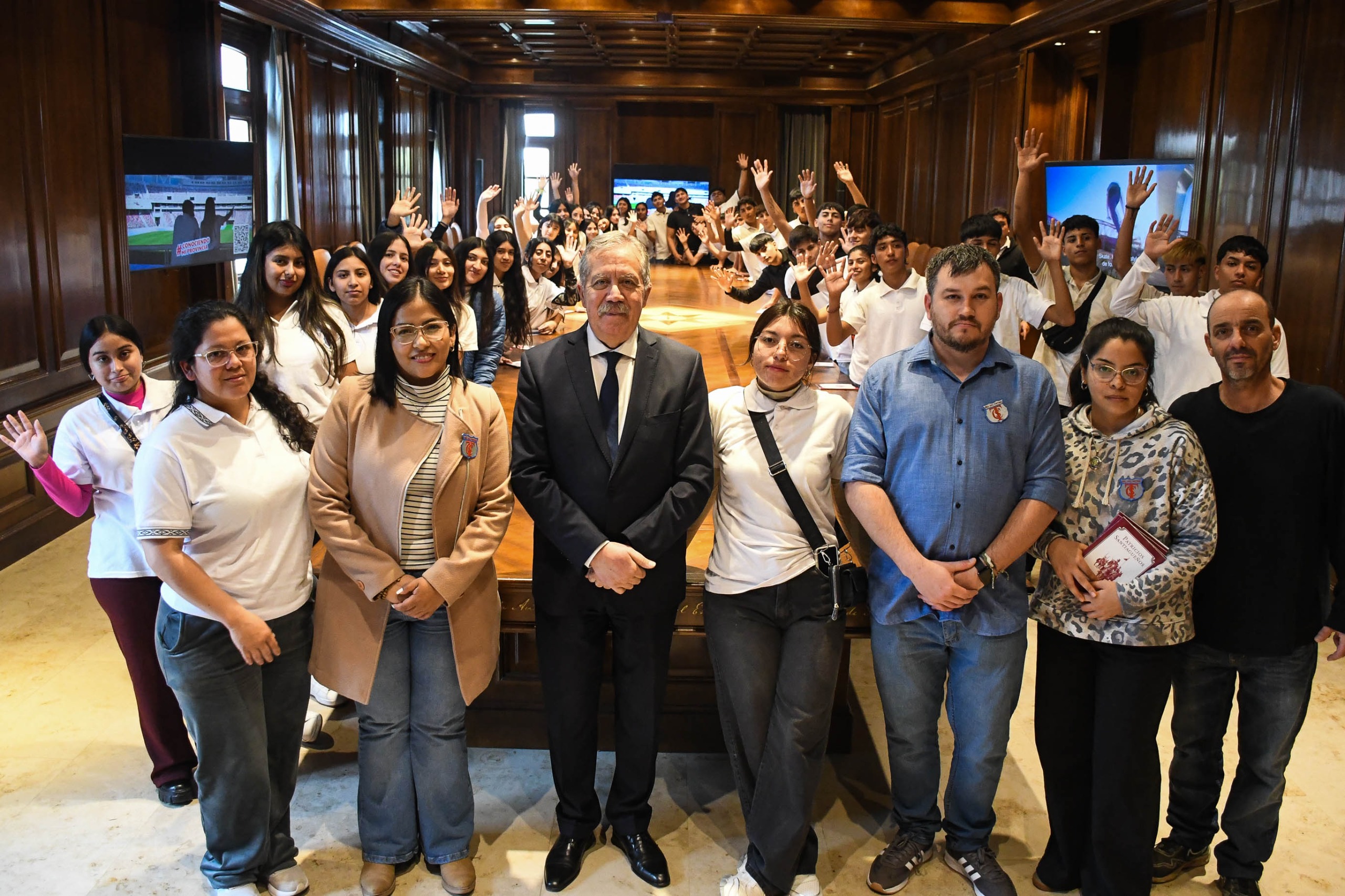 El jefe de Gabinete de Ministros, Elías Suárez, recibió este lunes en Casa de Gobierno a un contingente compuesto por 48 alumnos que cursan el quinto año en el Colegio Secundario de Tintina, departamento Moreno, quienes realizaron este viaje como parte del programa Conocimiento mi provincia, en un recorrido que incluye distintos lugares de la Capital, Las Termas y Villa La Punta.