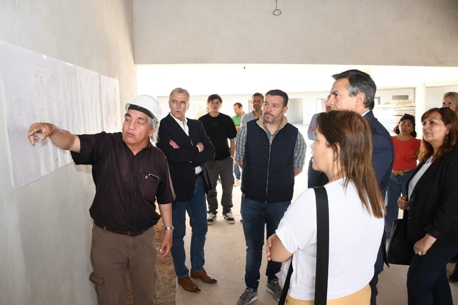 El secretario de Gobierno, Néstor Machado; el secretario de Planeamiento, Obras y Servicios Públicos, Jorge Vila; la subsecretaria de Educación, Nancy Bravo y la directora de Educación, Josefina Muratore; inspeccionaron el progreso de la imponente obra ubicada entre las calles Perito Moreno, Colón, Franklin Moyano y Santa María Magdalena.