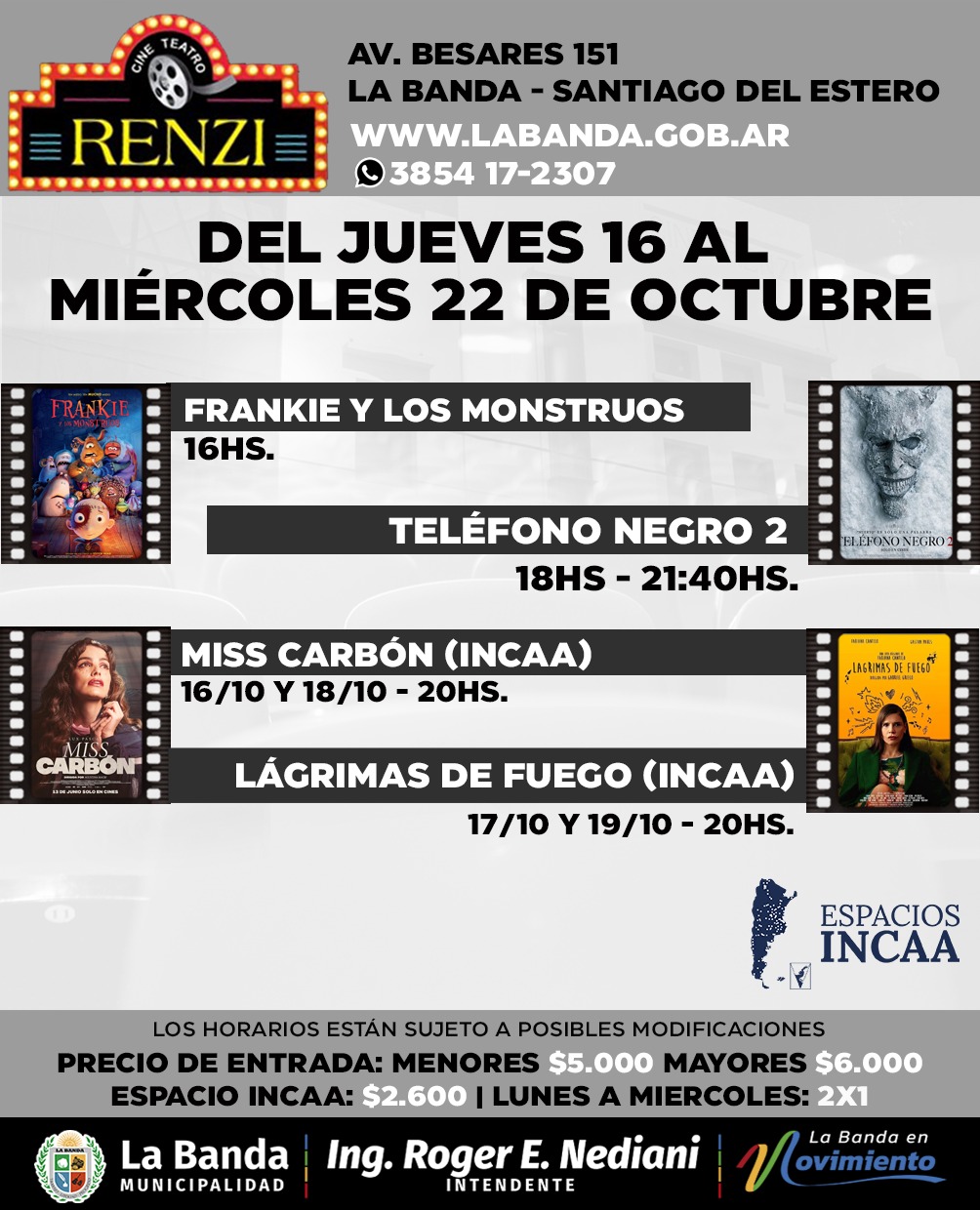 El Cine Teatro Renzi, dependiente de la municipalidad de La ciudad de La Banda, dió a conocer las películas extranjeras y nacionales que se proyectarán desde el jueves 16 hasta el miércoles 22 de octubre.